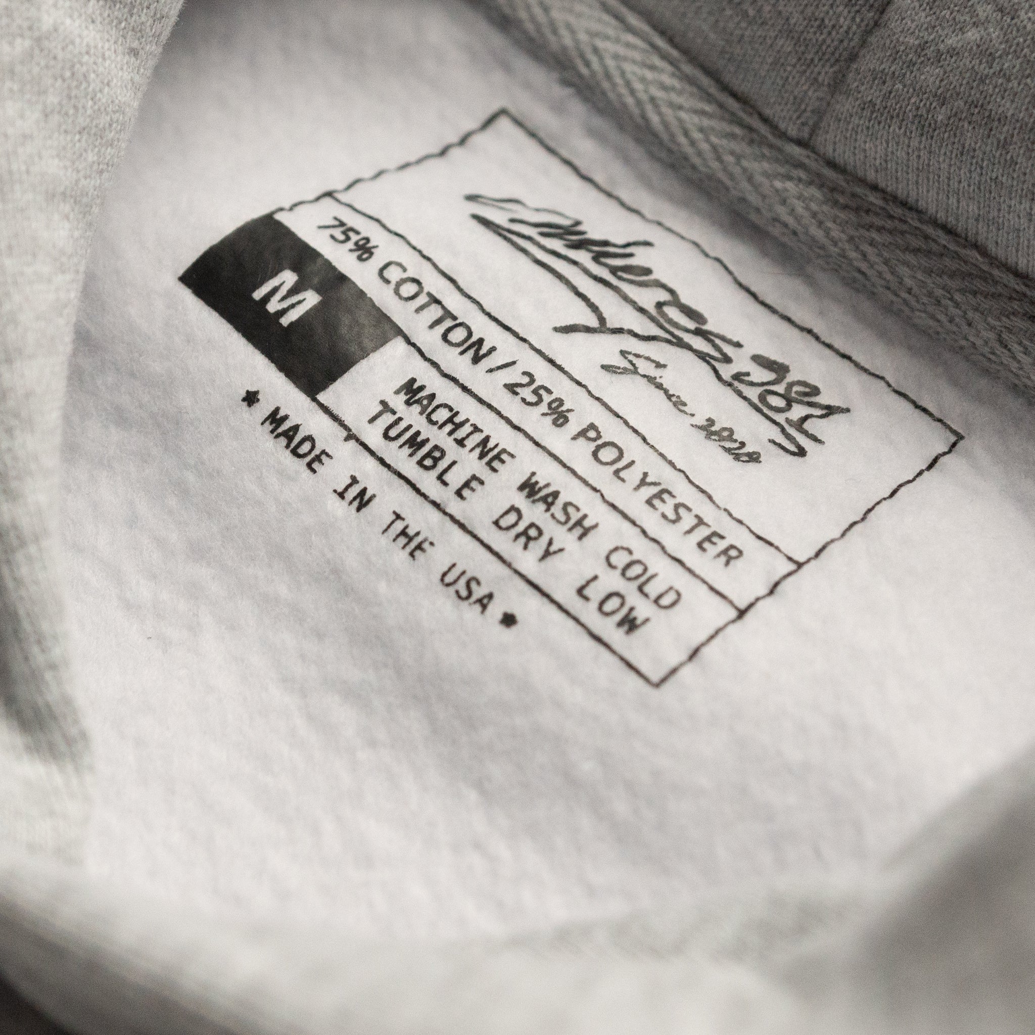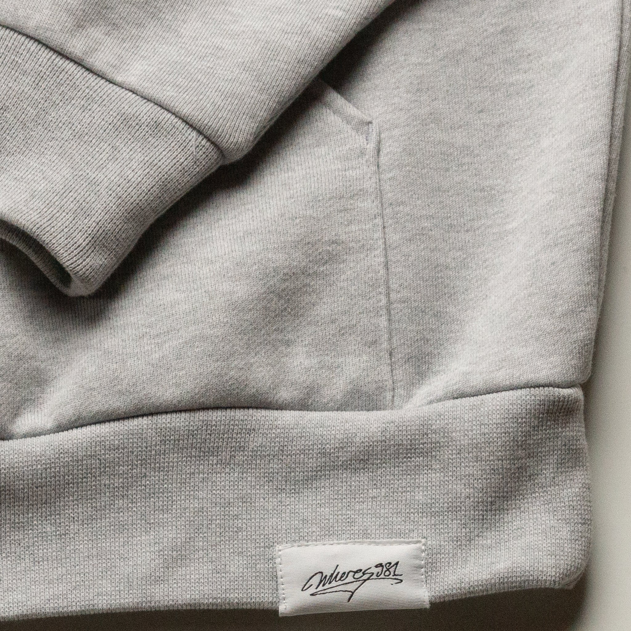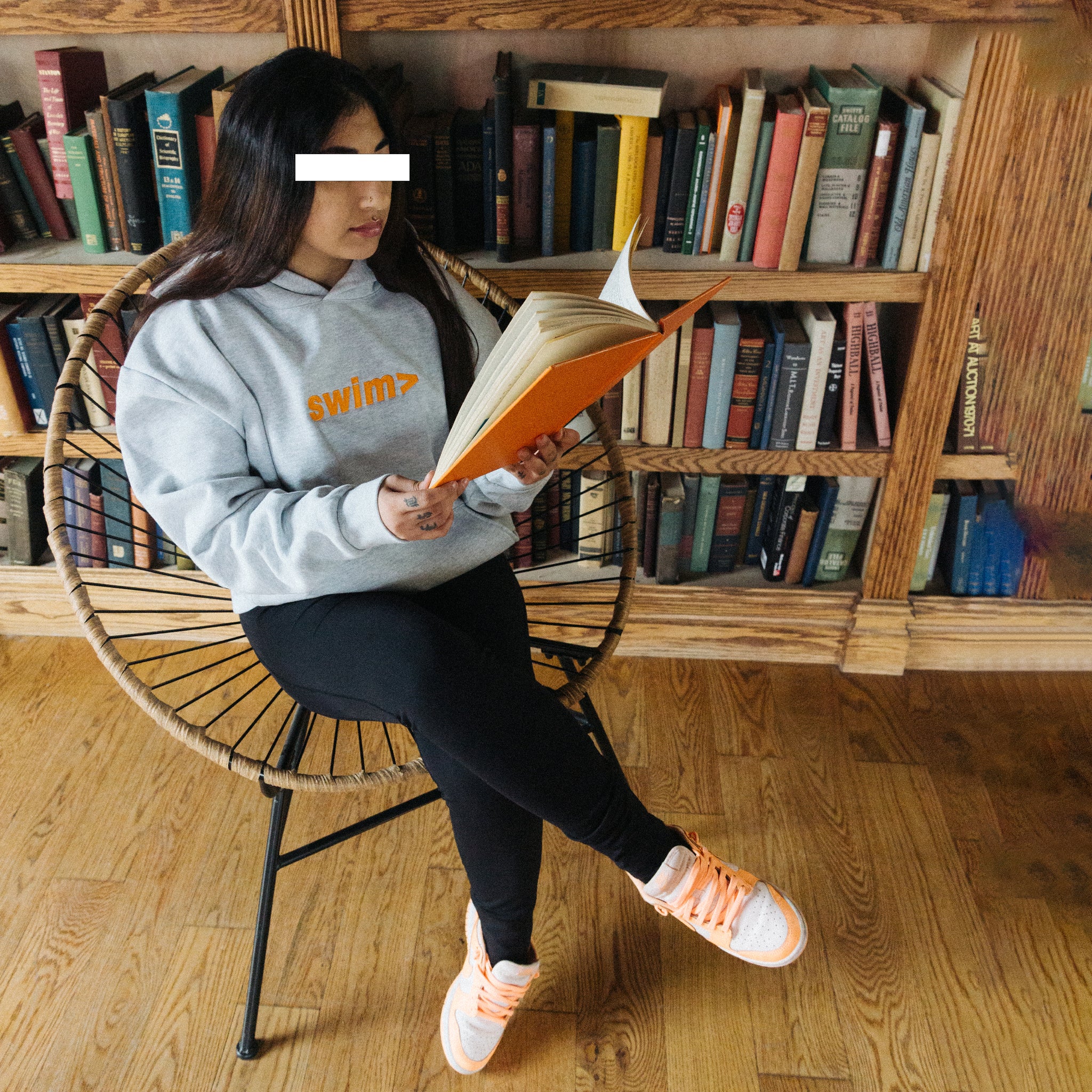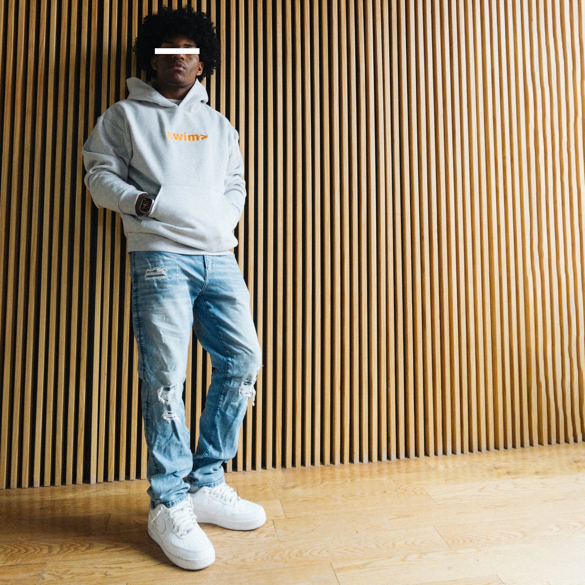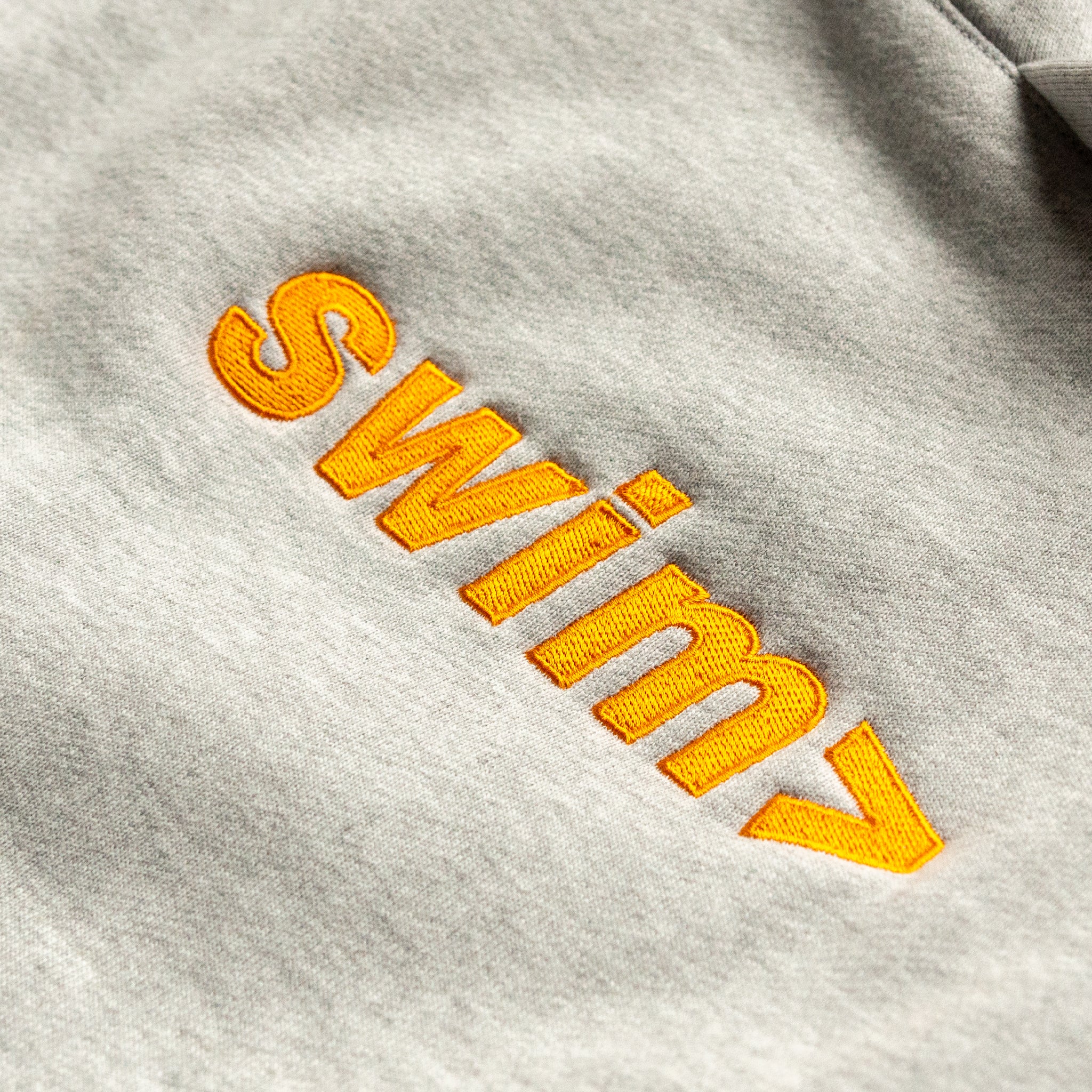 classic swim> logo (orange) embroidered onto a grey dyed hoodie
