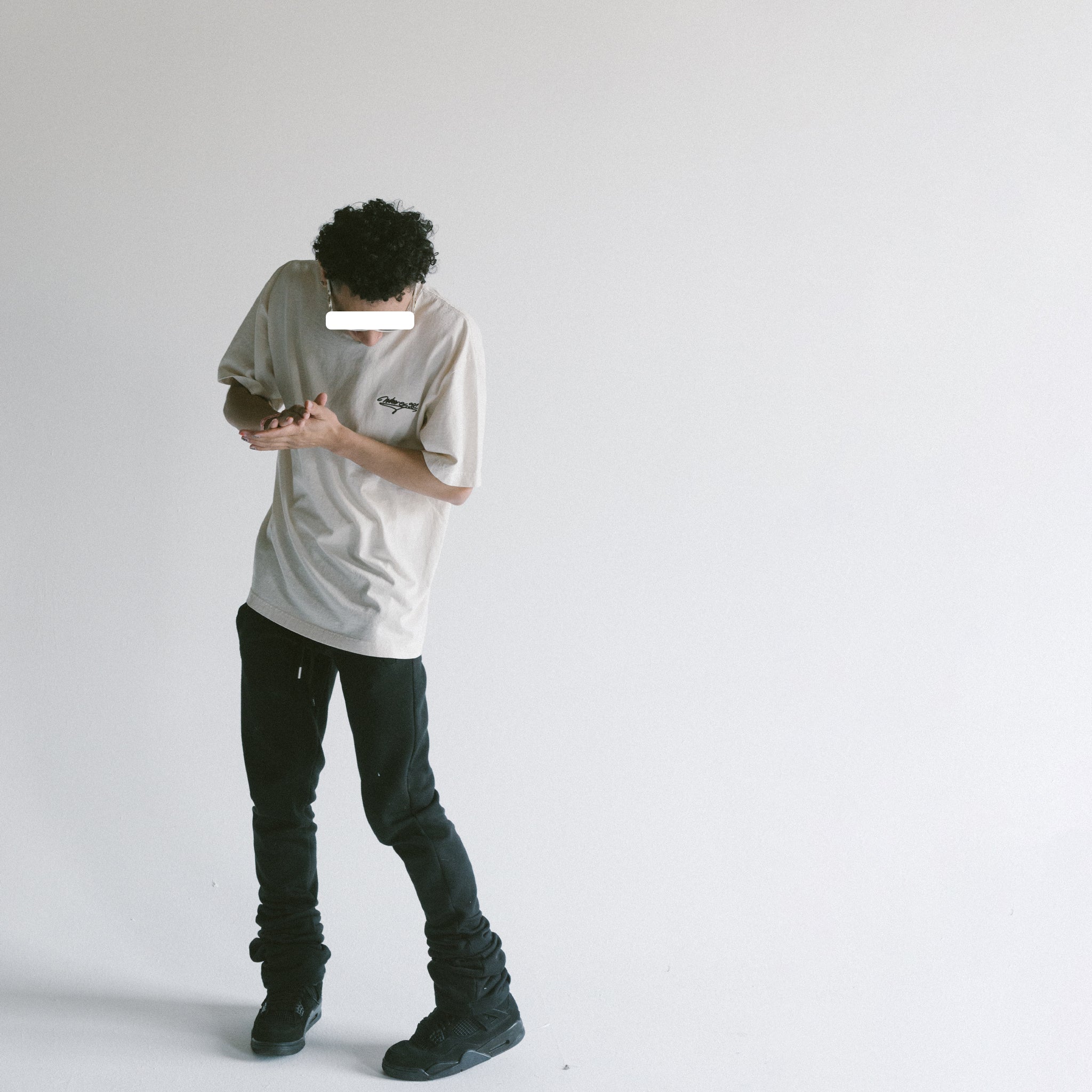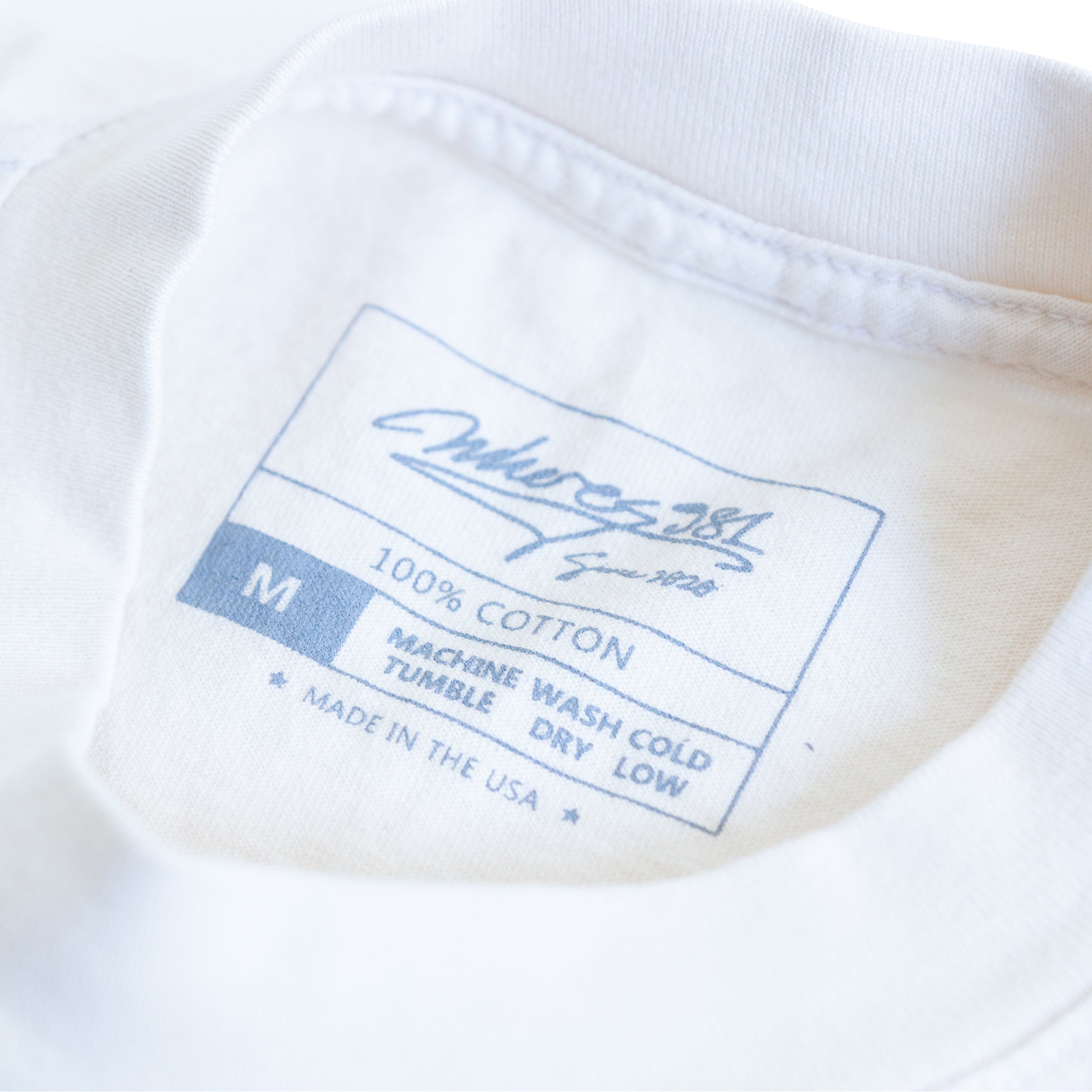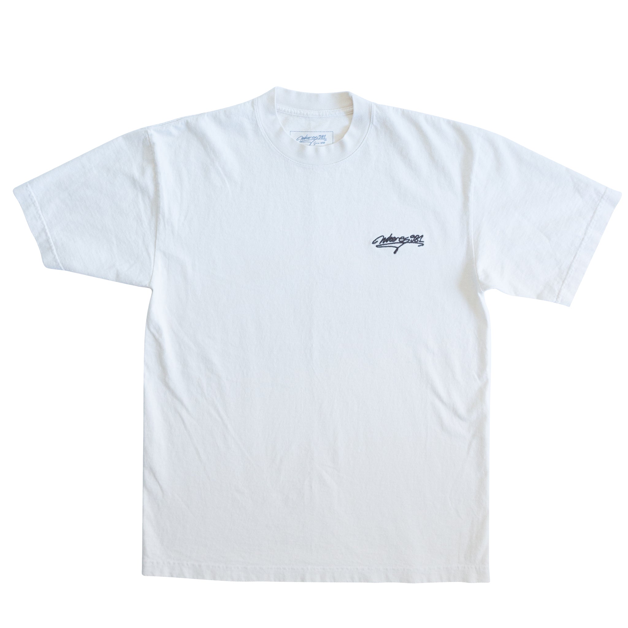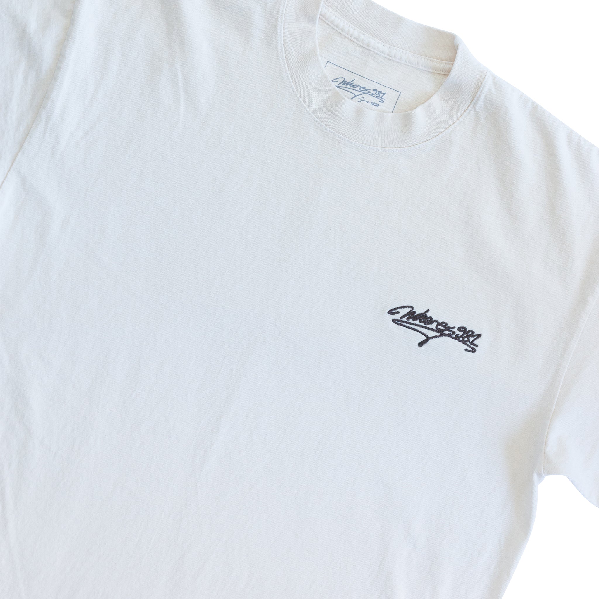 classic logo (dark grey) embroidered onto a off-white colored tee
